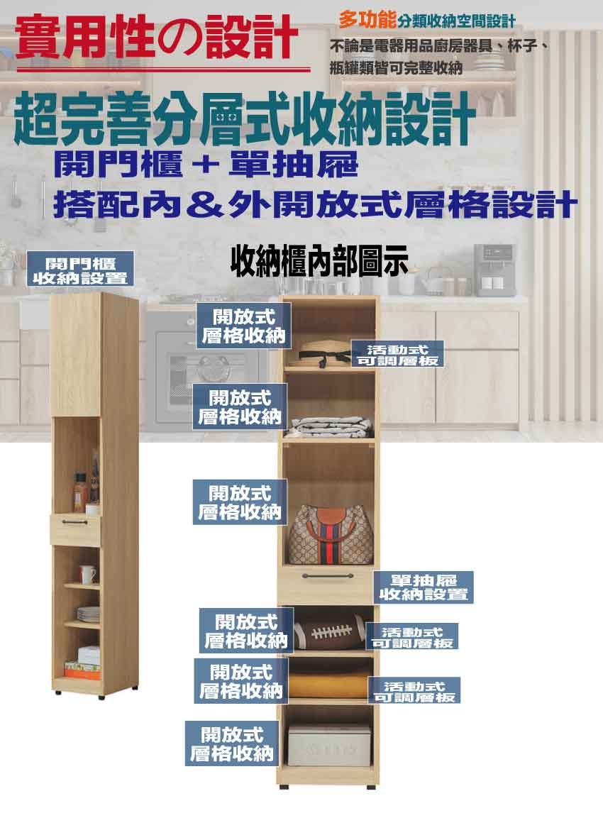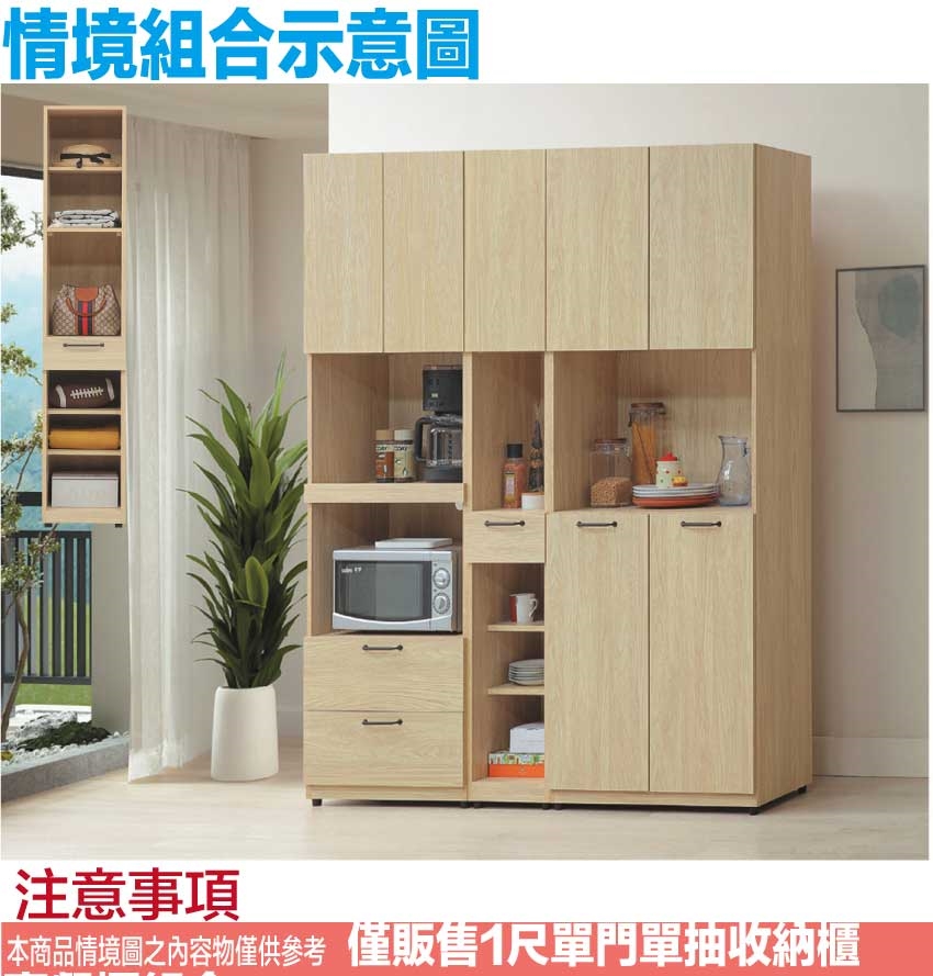 採用開門櫃+單抽屜+內&外開放層格等收納空間設計