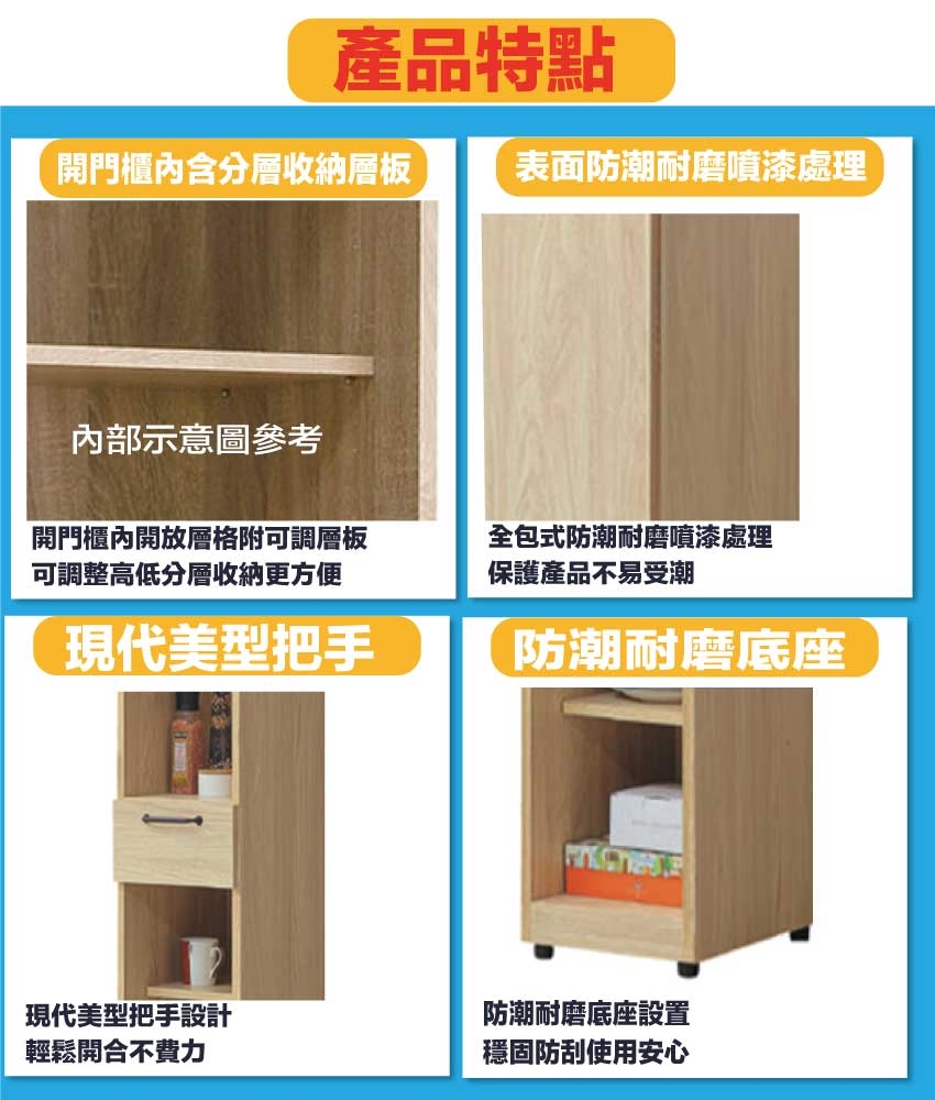 材質:防蛀木心板+防潮耐磨底座(可調高低水平)+防夾手緩衝門片五金 -