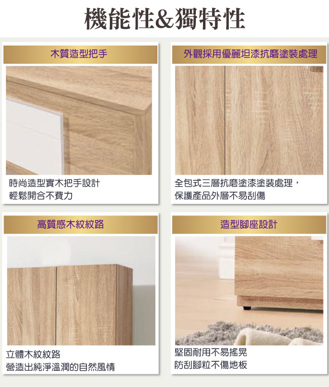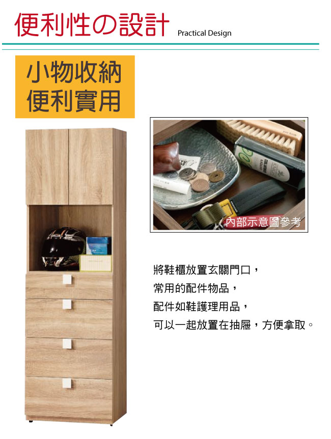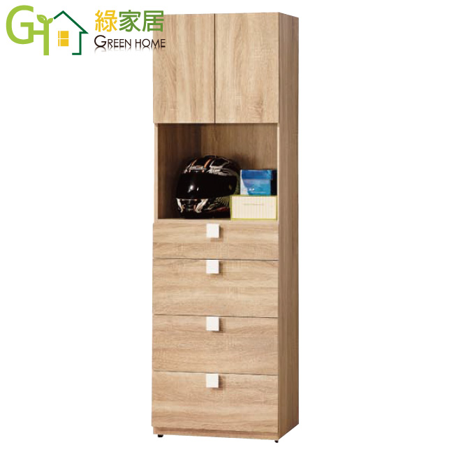 【綠家居】珍妮 時尚木紋2尺四抽高鞋櫃/玄關櫃 充滿雅緻風格的造型線條,高雅外觀提升居家雅緻品味,能輕鬆地融入各種空間風格,更顯一番氣質。鞋櫃為二門櫃+四抽屜的分層收納結構,讓您能妥善擺放各種物品,輕鬆收納保持居家整潔,同時也讓室內更顯開闊;搭配分層收納空間,採用開放式空間+防蛀木心板材質+優利坦抗磨三層全包式塗漆處理+防夾手緩衝門片五金+鋼珠滑軌等安全性結構,滑順好開操作變得容易自如等搭配設計,讓您不再煩惱耐用性,尺寸符合現在小宅空間所需,雅致且實用的設計,即使身在都市的喧囂鬧區,只要回到了家,就彷彿進入心中的一方小空間 【綠家居】珍妮 時尚木紋2尺四抽高鞋櫃/玄關櫃 可千萬別錯過喔!現在購買專人送到府服務,免組裝+免運費,讓你省時省力省運費!