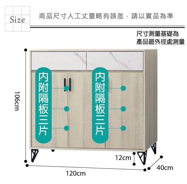 材質 | ◆產品名稱: 【綠家居】塞內加 雙色4尺三門二抽鞋櫃 尺寸:(寬)120x(深)40x(高)106/公分 ◆材質: 材質:防蛀木心板+黑鐵砂腳座+五金滑軌結構+防夾手緩衝門片五金 噴漆:防潮耐磨噴漆處理
