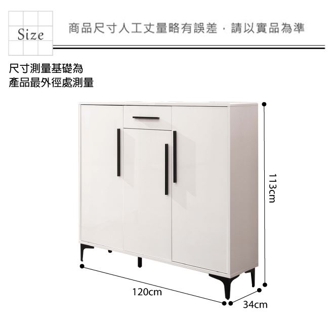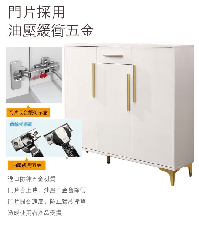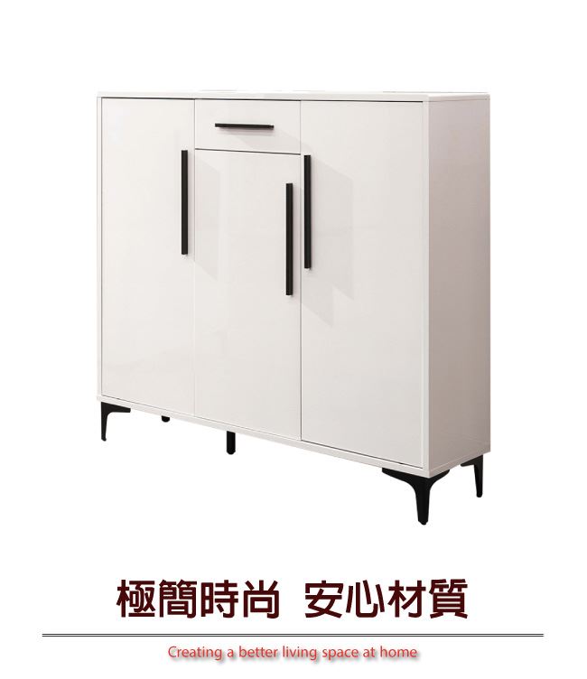 材質 | ◆產品名稱: 【綠家居】聖安 時尚4尺三門單抽鞋櫃/玄關櫃(二色可選) 尺寸:(寬)120x(深)34x(高)113/公分 ◆材質: 材質:防蛀木心板+五金滑軌結構+防鏽電鍍腳座+防夾手緩衝門片五金 外層採用亮面噴漆處理