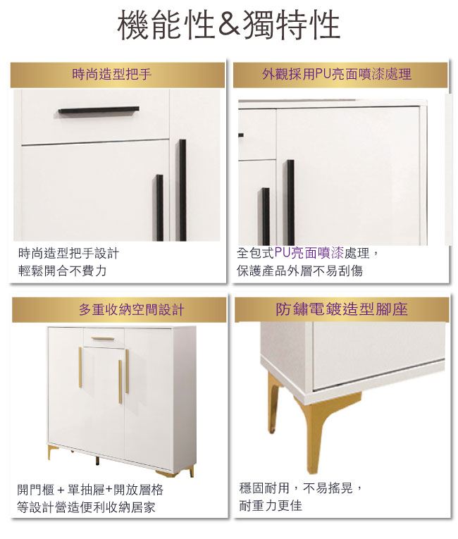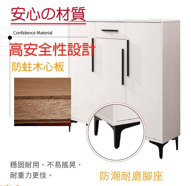 商品 介紹 | 【綠家居】聖安 時尚4尺三門單抽鞋櫃/玄關櫃(二色可選) 二色可選+現代簡約風格+安心材質製造,整體採用防蛀木心板+五金滑軌結構+防鏽電鍍腳座+防夾手緩衝門片五金等安心材質製造,搭配採用開門櫃+單抽屜+內開放式收納等收納空間設計,全由專人配送到家,專業安心服務,替你省下更多時間! 【商品特色】 二色可選+現代簡約風格+安心材質製造,使用放心+搭配居家更便利 採用防蛀木心板+五金滑軌結構++防鏽電鍍腳座+防夾手緩衝門片五金等安心材質製造 採用開門櫃+單抽屜+內開放式收納等收納空間設計 此商品不需要DIY組立,此商品為組立後之成品 全由專人配送到家,專業安心服務,替您省下更多時間 |