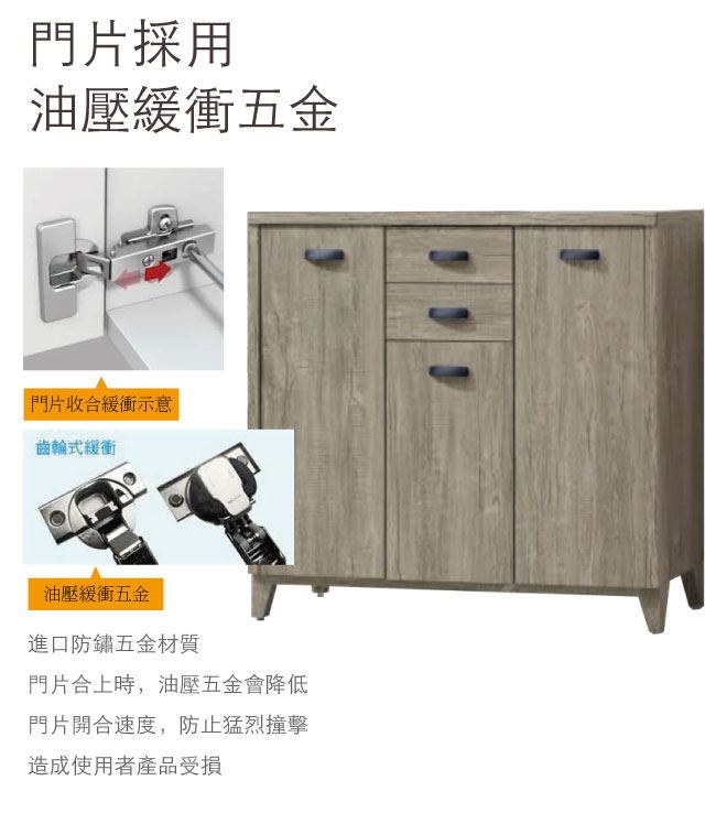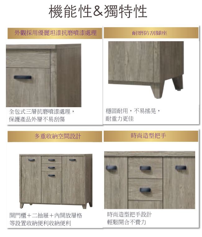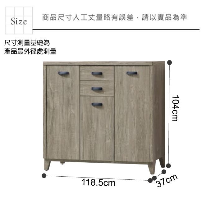尺寸:(寬)118.5x(深)37(高)104公分 ◆材質: 材質:防蛀木心板+防潮耐磨腳座+五金滑軌結構+防夾手緩衝門片五金 噴漆:防潮耐磨噴漆處理