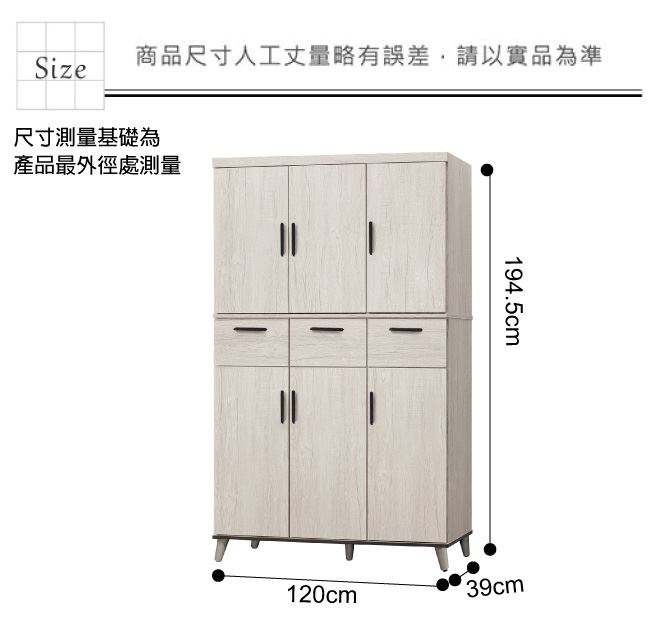 尺寸:(寬)120x(深)39(高)194.5公分 ◆材質: 材質:防蛀木心板+防潮實木腳座+五金滑軌結構+防夾手緩衝門片五金 噴漆:防潮耐磨噴漆處理
