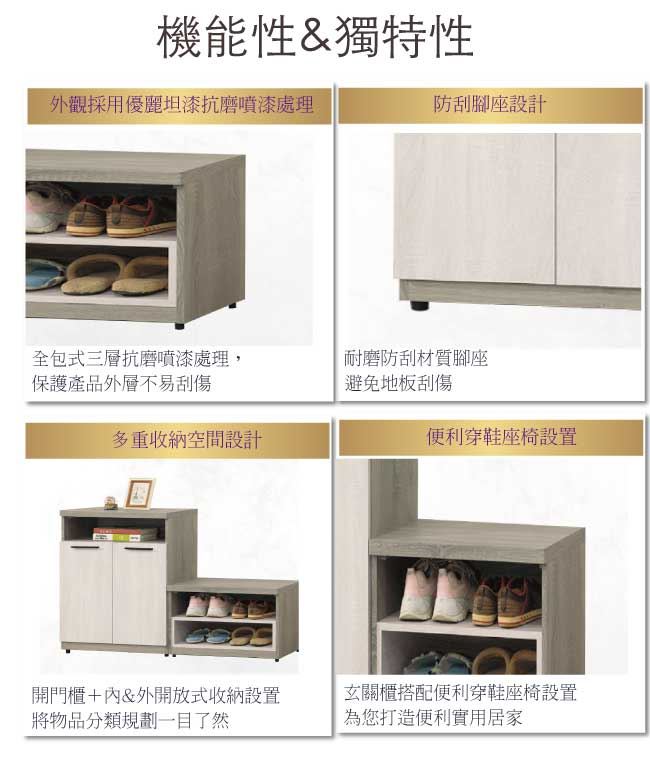 商品 介紹 | 【綠家居】夏亞雙色4尺多功能玄關櫃組合 木紋雙色系+現代簡約風格+安心材質製造,整體採用防蛀木心板+防刮耐磨腳座+防夾手緩衝門片五金等安心材質製造,產品外層採用防潮耐磨噴漆處理搭配採用開門櫃+穿鞋坐櫃+內&外開放式收納等收納空間設計,全由專人配送到家,專業安心服務,替你省下更多時間! 【商品特色】 木紋雙色系+現代簡約風格+安心材質製造,使用放心+搭配居家更便利 採用防蛀木心板+防刮耐磨腳座+防夾手緩衝門片五金等安心材質製造 產品外層採用防潮耐磨噴漆處理 搭配採用開門櫃+穿鞋坐櫃+內&外開放式收納等收納空間設計 此商品不需要DIY組立,此商品為組立後之成品 品質保證、專業設計、貼心服務 全由專人配送到家,專業安心服務,替您省下更多時間 |