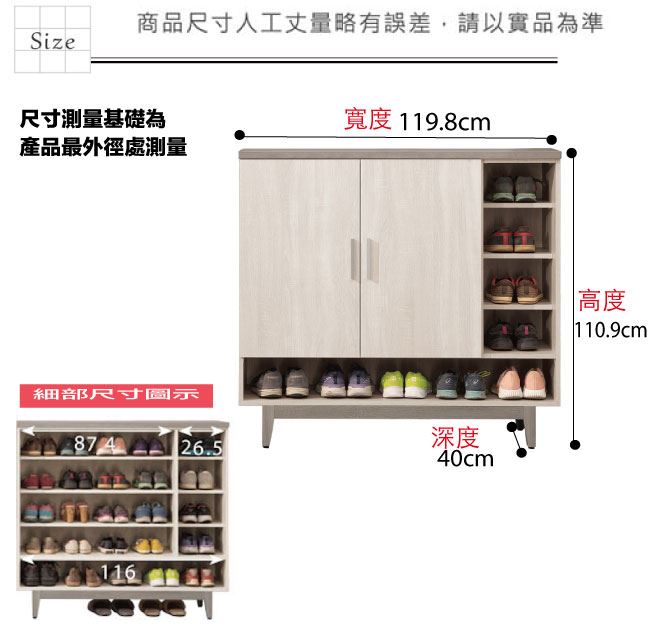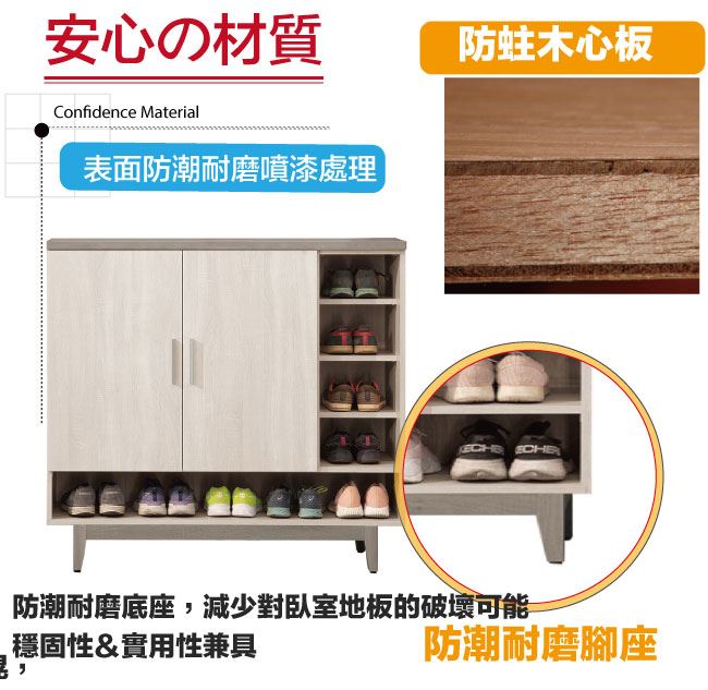 材質 | ◆產品名稱:【綠家居】芙娜雙色4尺雙門半開放鞋櫃 尺寸:(寬)119.8x(深)40(高)110.9公分 ◆材質: 材質:防蛀木心板+防潮耐磨腳座+防夾手緩衝門片五金 噴漆:防潮耐磨噴漆處理