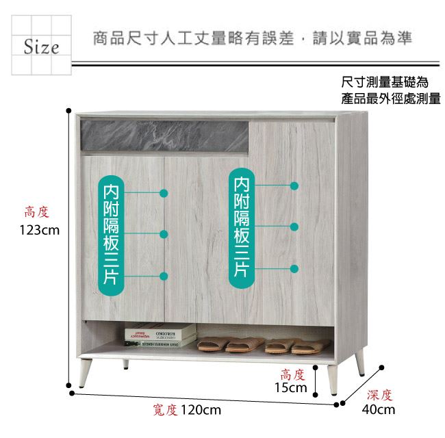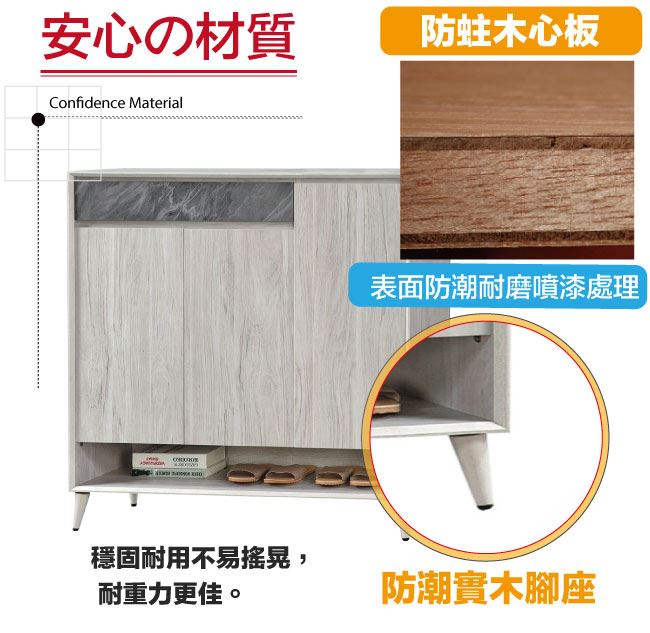 材質 | ◆產品名稱:【綠家居】依卡雅4尺三門單抽玄關鞋櫃 尺寸:(寬)120x(深)40(高)123/公分 ◆材質: 材質:防蛀木心板+防潮實木腳座+五金滑軌結構+防夾手緩衝門片五金 噴漆:防潮耐磨噴漆處理
