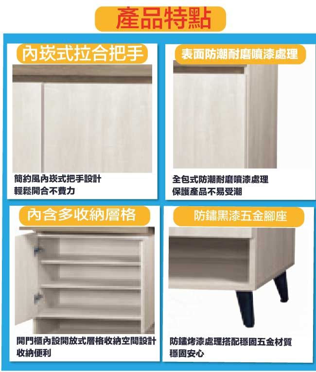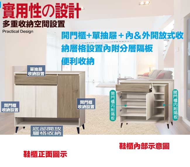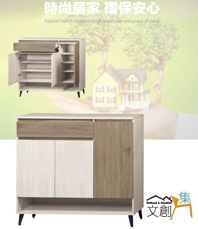 商 品 介 紹 | 【綠家居】麥里雙色4尺三門單抽鞋櫃 木紋雙色系+現代簡約風格+安心材質製造,整體採用防蛀木心板+防鏽黑漆五金腳座+五金滑軌結構等安心材質製造,產品外層採用防潮耐磨噴漆處理搭配採用開門櫃+單抽屜+內&外開放層格等收納空間設計,全由專人配送到家,專業安心服務,替你省下更多時間! 【商品特色】 木紋雙色系+現代簡約風格+安心材質製造,使用放心+搭配居家更便利 採用防蛀木心板+防鏽黑漆五金腳座+五金滑軌結構等安心材質製造 產品外層採用防潮耐磨噴漆處理 搭配採用開門櫃+單抽屜+內&外開放層格等收納空間設計 此商品不需要DIY組立,此商品為組立後之成品 全由專人配送到家,專業安心服務,替您省下更多時間