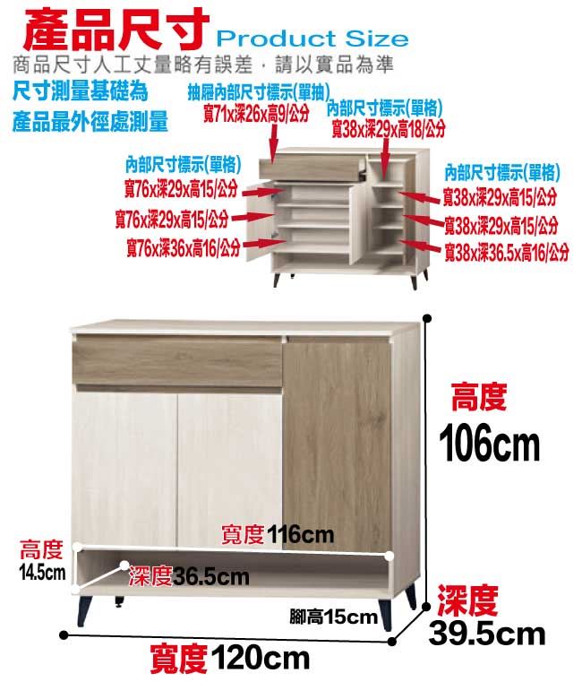 材質 | ◆產品名稱:【綠家居】麥里雙色4尺三門單抽鞋櫃 尺寸:(寬)120x(深)39.5(高)106/公分 ◆材質: 材質:防蛀木心板+防鏽黑漆五金腳座+五金滑軌結構 噴漆:防潮耐磨噴漆處理 |