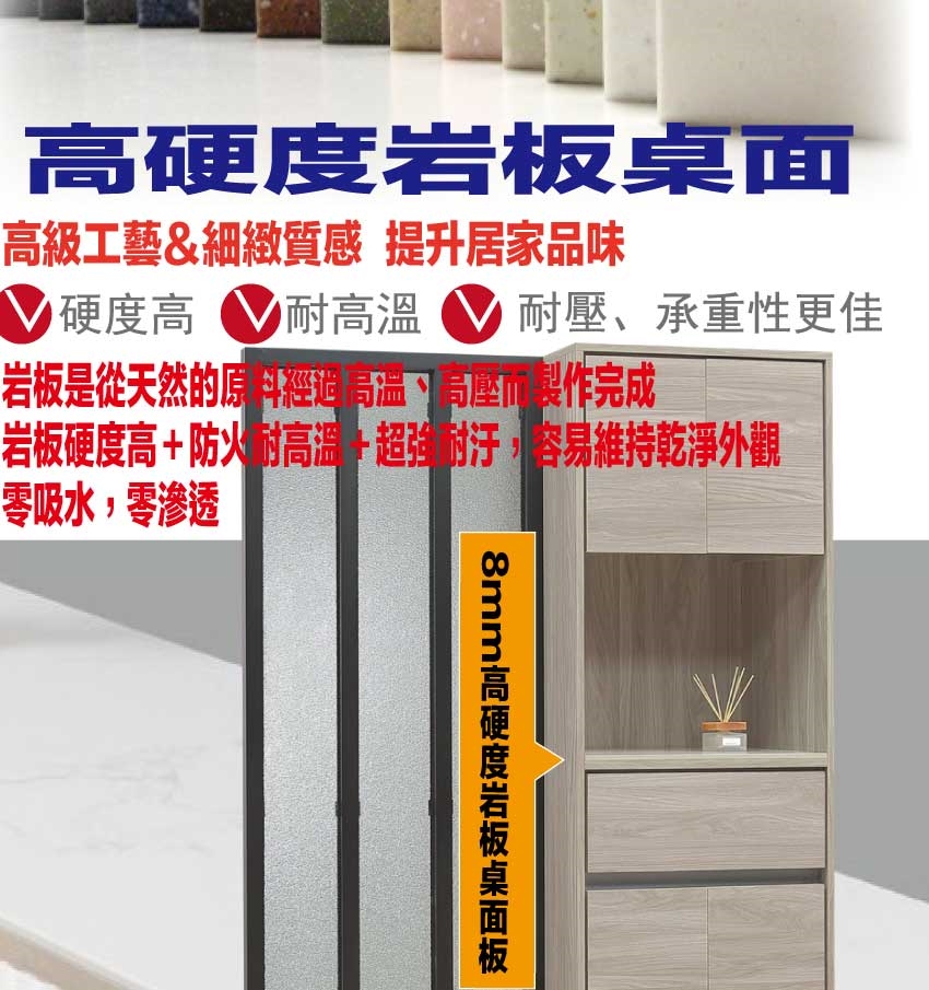 採用防蛀木心板+防夾手緩衝門片五金+防潮耐磨底座+五金滑軌結構+12mm高硬度岩板桌面板等安心材質製造