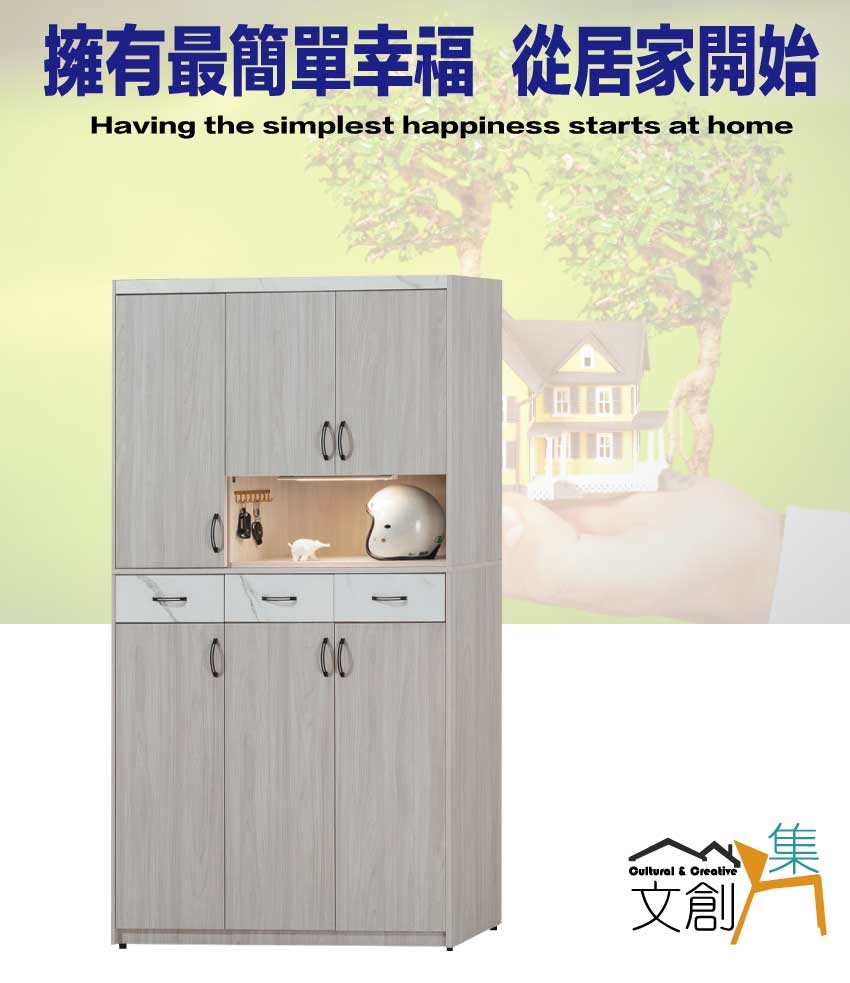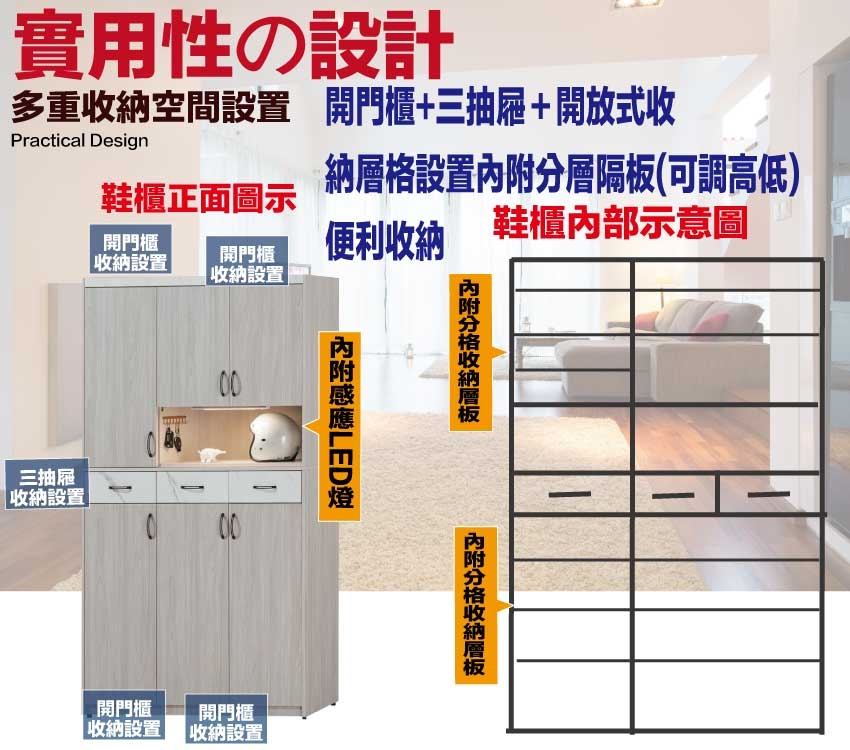 搭配採用開門櫃+三抽屜+內&外開放層格等收納空間設計