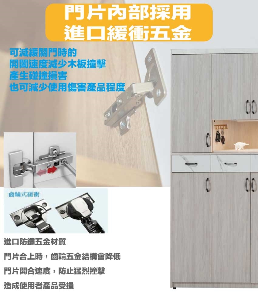 材質:防蛀木心板+耐磨美耐皿面板+防潮耐磨底座+防夾手緩衝門片五金+五金滑軌結構