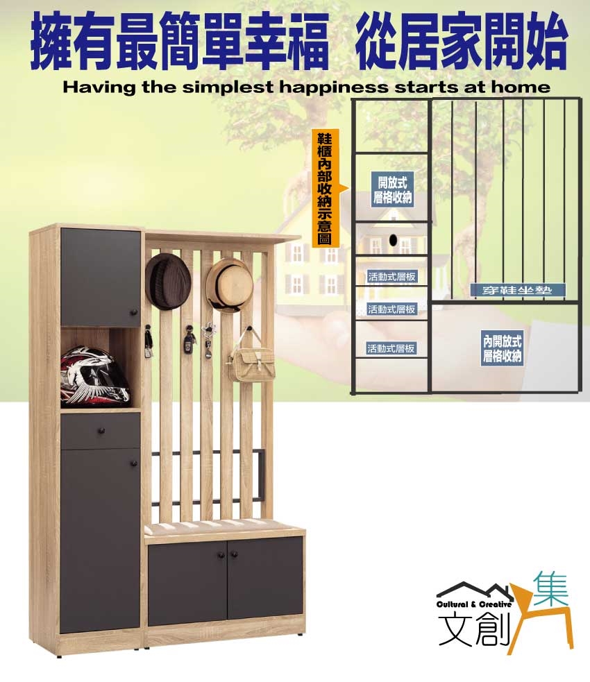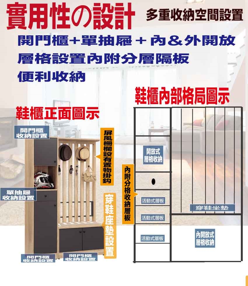 搭配採用開門櫃+單抽屜+內&外開放層格+穿鞋座墊設置等收納空間設計