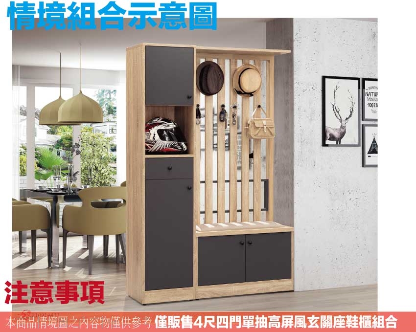 - ◆產品名稱:【綠家居】麥莉4尺四門單抽高屏風玄關座鞋櫃組合(穿鞋座墊設置)