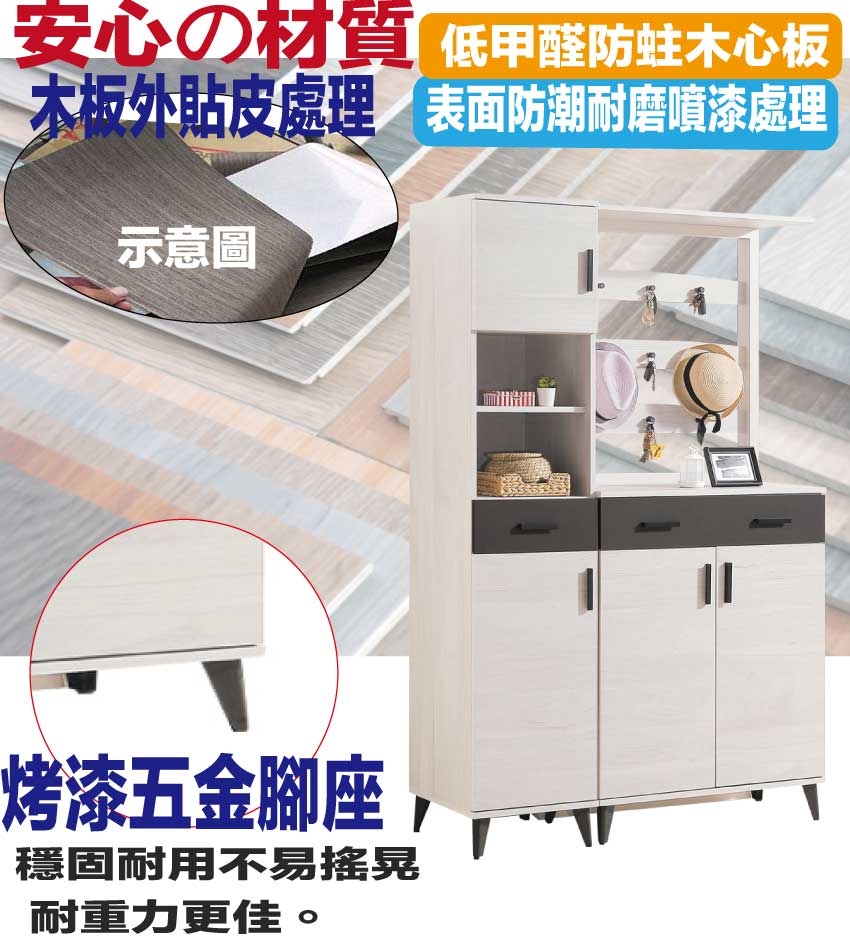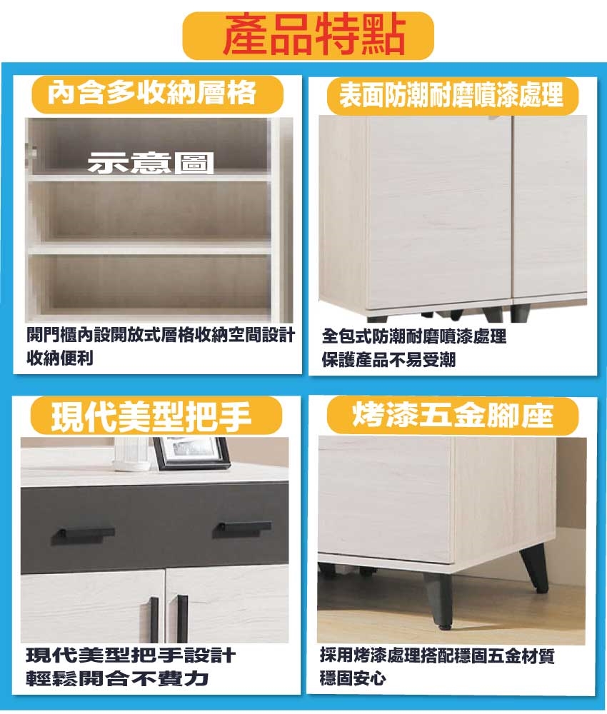 材質:防蛀木心板+五金滑軌結構+烤漆五金腳座+防夾手緩衝門片五金