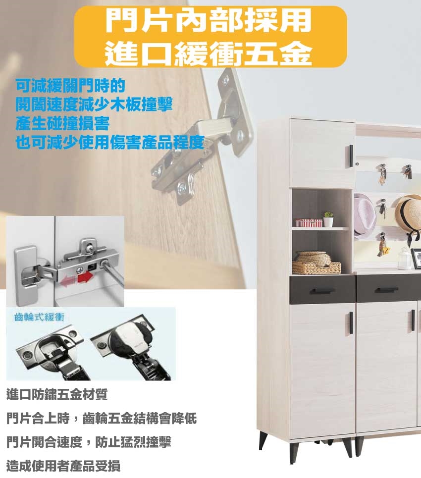 採用防蛀木心板+五金滑軌結構+烤漆五金腳座+防夾手緩衝門片五金等安心材質製造