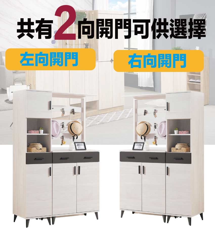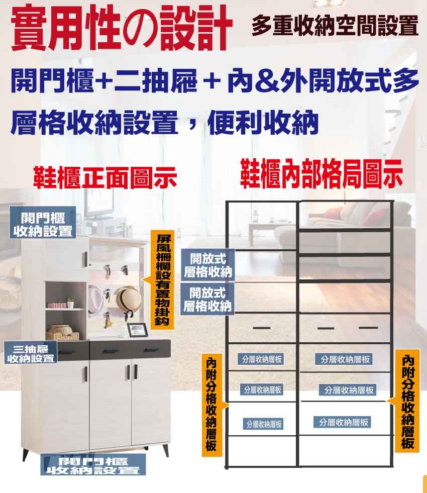搭配採用開門櫃+二抽屜+內&外開放層格等收納空間設計