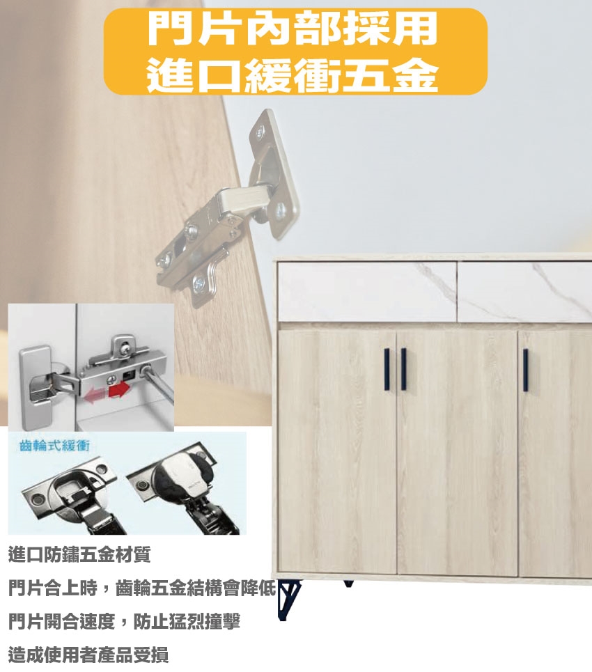 防蛀木心板+烤漆五金腳座+五金滑軌結構+防夾手緩衝五金等安心材質製造