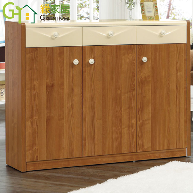 【綠家居】桃樂絲 時尚木紋雙色4.2尺開門式鞋櫃/玄關櫃 木材使用高級MDF材質+優麗坦三層耐磨塗漆處理,清潔保養容易。讓鞋櫃整體外觀光滑有緻,抽屜採用造型把手+鋼珠滑軌結構,使用上拉合不費力,防夾手緩衝門片五金,讓您使用上更安心。內附透氣孔+三大片三小片活動隔板,質感更上一層樓。三門+三抽收納設計,讓您的鞋子分層分類輕鬆容易,物品不會有找不到的困擾。讓親朋好友到訪時,分享你的品味! 【綠家居】桃樂絲 時尚木紋雙色4.2尺開門式鞋櫃/玄關櫃 設計簡單大方,色澤自然清新!現在購買享專人送到府服務,免組裝的服務喔!!