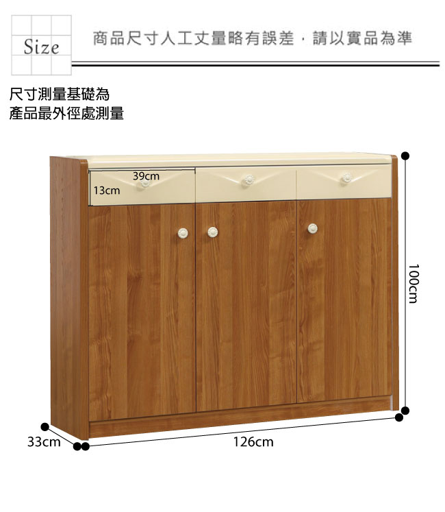 ◆產品名稱:【綠家居】桃樂絲 時尚木紋雙色4.2尺開門式鞋櫃/玄關櫃 ◆產品尺寸: (寬)126 x (深)33 x (高)100 公分 ◆產品材質: 材質:高級MDF材質 塗裝:優麗坦三層耐磨塗漆處理 背板:美背處理 五金:鋼珠滑軌+防夾手緩衝五金 商品編號 | 尺寸 | 顏色 | 組裝方式 |