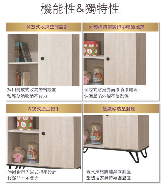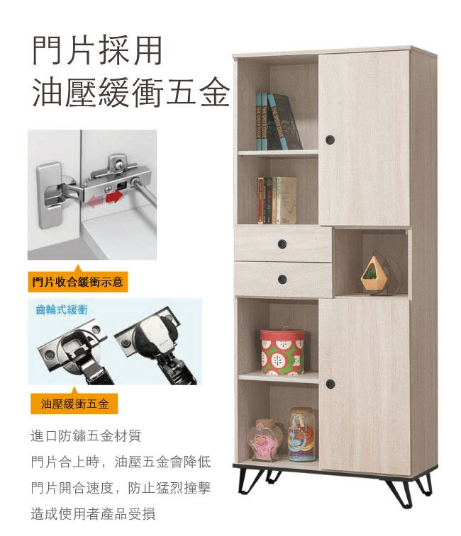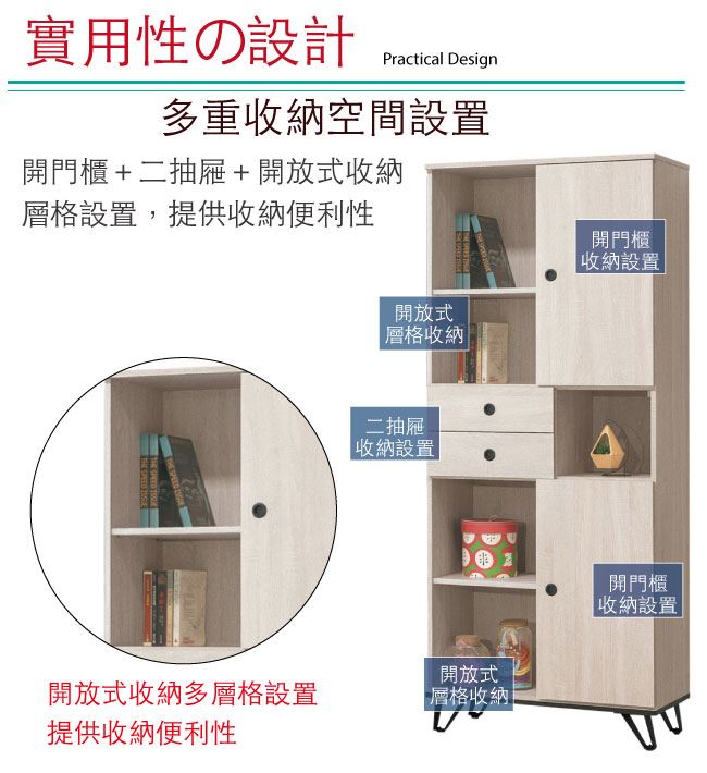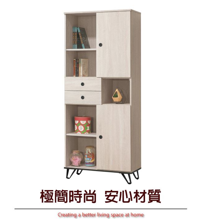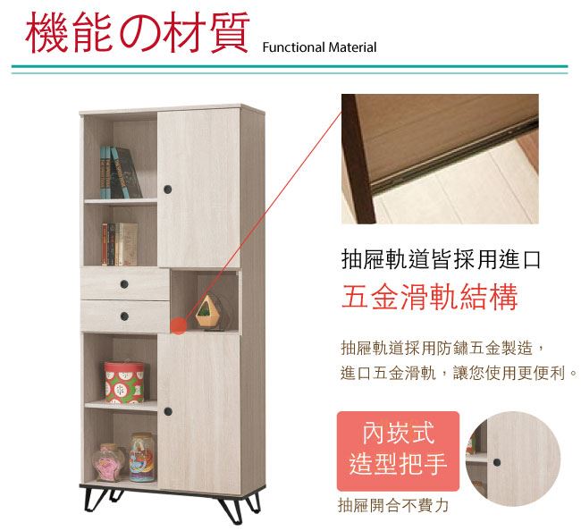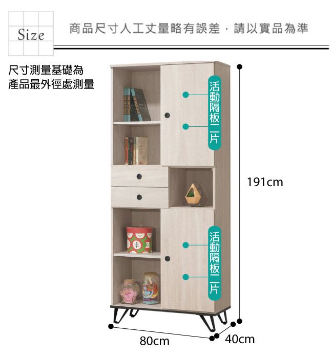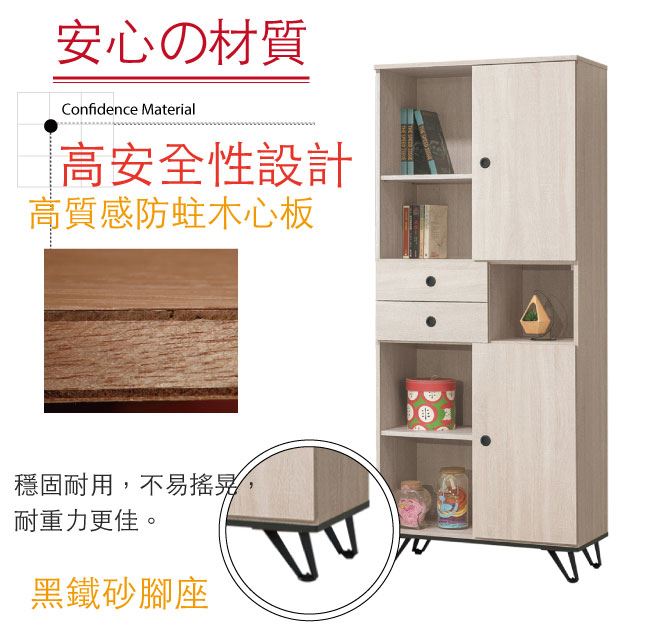 材質 | ◆產品名稱:【綠家居】 洛沃 時尚2.7尺右開二門二抽書櫃/收納櫃 尺寸:(寬)80x(深)40x(高)191/公分 ◆材質: 材質:防蛀木心板+五金滑軌結構+防鏽黑漆腳座+防夾手緩衝門片五金 |