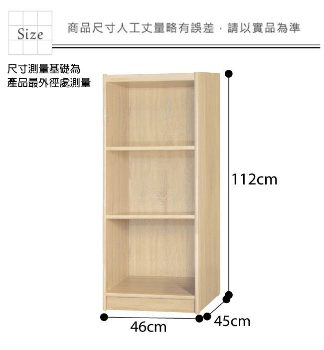材質 | ◆產品名稱:【綠家居】基斯坦 現代1.5尺三格書櫃/收納櫃(三色可選) 收納櫃尺寸:(寬)46x(深)45x(高)112/公分 ◆材質: 材質:防蛀木心板 塗漆:優利坦全包式耐磨噴漆處理 |