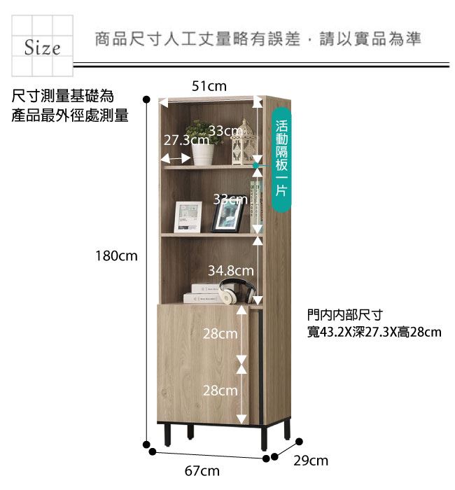 材質 | ◆產品名稱: 【綠家居】可洛 時尚1.8尺單門半開放書櫃 尺寸:(寬)55x(深)29x(高)180/公分 ◆材質: 材質:防蛀木心板+黑鐵砂腳座+防夾手緩衝門片五金 噴漆:防潮耐磨噴漆處理