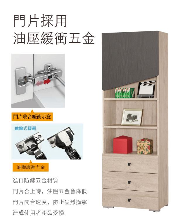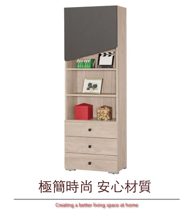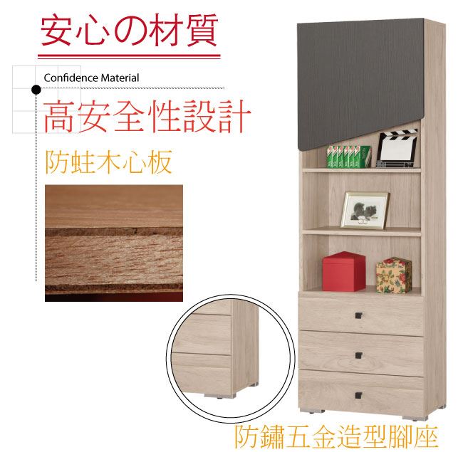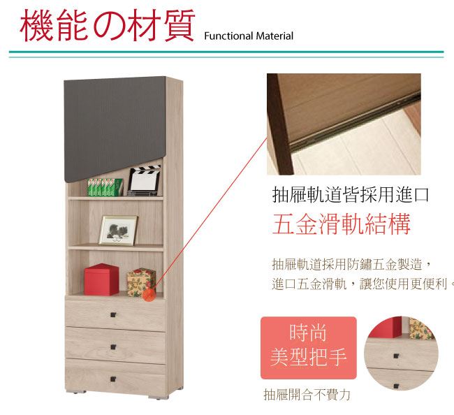 材質 | ◆產品名稱: 【綠家居】羅麗 雙色2尺單門三抽書櫃/收納櫃 產品尺寸: 尺寸:(寬)60x(深)32x(高)182/公分 ◆材質: 材質:防蛀木心板+防潮耐磨腳座 材質:五金滑軌結構+防夾手緩衝門片五金 塗漆:優利坦全包式耐磨噴漆處理