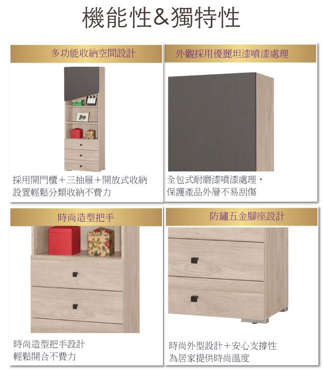 商品 介紹 | 【綠家居】羅麗 雙色2尺單門三抽書櫃/收納櫃 木紋雙色系+現代簡約風格+安心材質製造,整體採用防蛀木心板+防潮耐磨腳座+五金滑軌結構+防夾手緩衝門片五金等安心材質製造,外層採用優利坦全包式耐磨噴漆處理搭配開門櫃+三抽屜+內&外開放式層格等收納空間設計,全由專人配送到家,專業安心服務,替你省下更多時間! 【商品特色】 木紋雙色系+現代簡約風格+安心材質製造,使用放心+搭配居家更便利 採用防蛀木心板+防潮耐磨腳座+五金滑軌結構+防夾手緩衝門片五金等安心材質製造 開門櫃+三抽屜+內&外開放式層格等收納空間設計 此商品不需要DIY組立,此商品為組立後之成品 品質保證、專業設計、貼心服務 全由專人配送到家,專業安心服務,替您省下更多時間 |