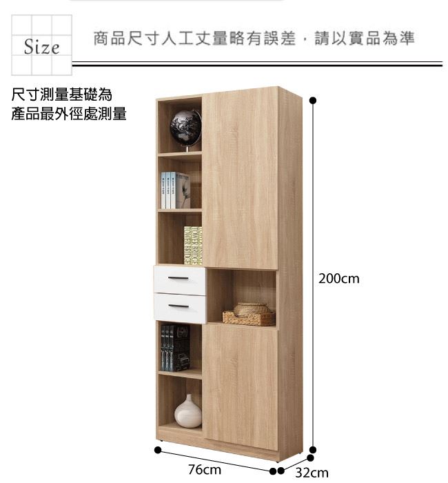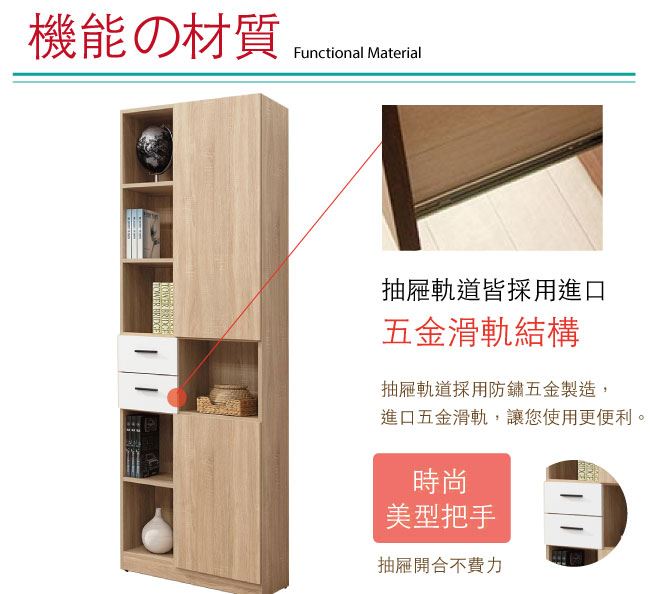 材質 | ◆產品名稱: 【綠家居】西巴 時尚2.5尺二門二抽書櫃/收納櫃 尺寸:(寬)76x(深)32x(高)200/公分 ◆材質: 材質:防蛀木心板+防潮耐磨腳座+五金滑軌結構+防夾手緩衝門片五金 噴漆:外層採用防潮耐磨&亮面噴漆處理