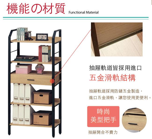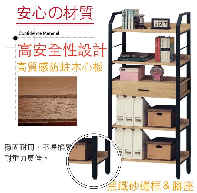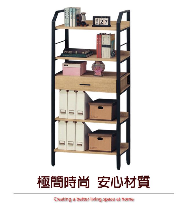 商品 介紹 | 【綠家居】卡約納 時尚2.7尺單抽四格書櫃/收納櫃 木紋雙色系+現代簡約風格+安心材質製造,整體採用防蛀木心板+黑鐵砂框架&腳座+五金滑軌結構等安心材質製造,搭配採用單抽屜+開放式層格等收納空間設計,全由專人配送到家,專業安心服務,替你省下更多時間! 【商品特色】 木紋雙色系+現代簡約風格+安心材質製造,使用放心+搭配居家更便利 採用防蛀木心板+黑鐵砂框架&腳座+五金滑軌結構等安心材質製造 採用單抽屜+開放式層格等收納空間設計 此商品不需要DIY組立,此商品為組立後之成品 品質保證、專業設計、貼心服務 全由專人配送到家,專業安心服務,替您省下更多時間 |