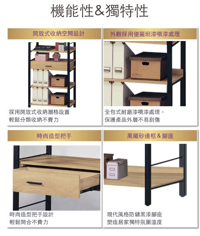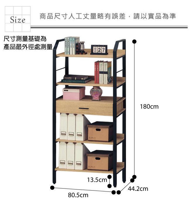 材質 | ◆產品名稱: 【綠家居】卡約納 時尚2.7尺單抽四格書櫃/收納櫃 尺寸:(寬)80.5x(深)44.2x(高)180/公分 ◆材質: 材質:防蛀木心板+黑鐵砂框架&腳座+五金滑軌結構