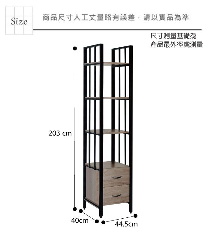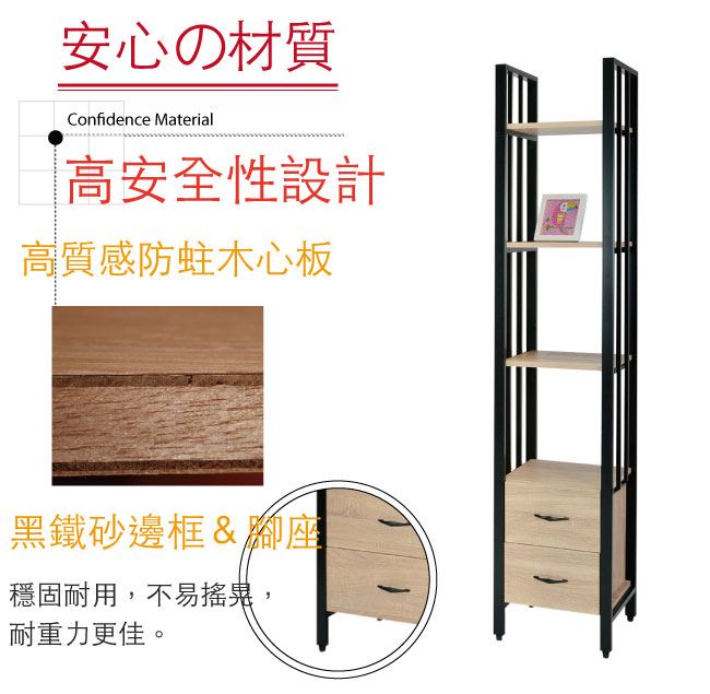 材質 | ◆產品名稱: 【綠家居】歐蒂 現代1.5尺二抽高書櫃/收納櫃(二色可選) 產品尺寸: 尺寸:(寬)44.5(深)40x(高)203/公分 ◆材質: 材質:防蛀木心板+五金滑軌結構+黑鐵砂邊框&腳座 塗漆:優利坦全包式耐磨噴漆處理