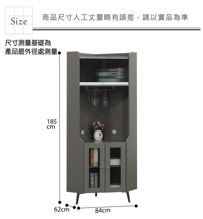 尺寸:(寬)84x(深)62(高)185公分 ◆材質: 材質:防潮MDF板材+防鏽黑漆腳座+強化玻璃門片 噴漆:防潮亮面噴漆處理