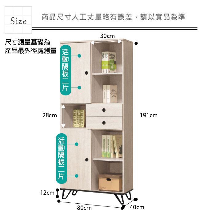 尺寸:(寬)80x(深)40(高)191公分 ◆材質: 材質:防蛀木心板+黑鐵砂腳座+防夾手緩衝門片五金+五金滑軌結構 噴漆:防潮耐磨噴漆處理