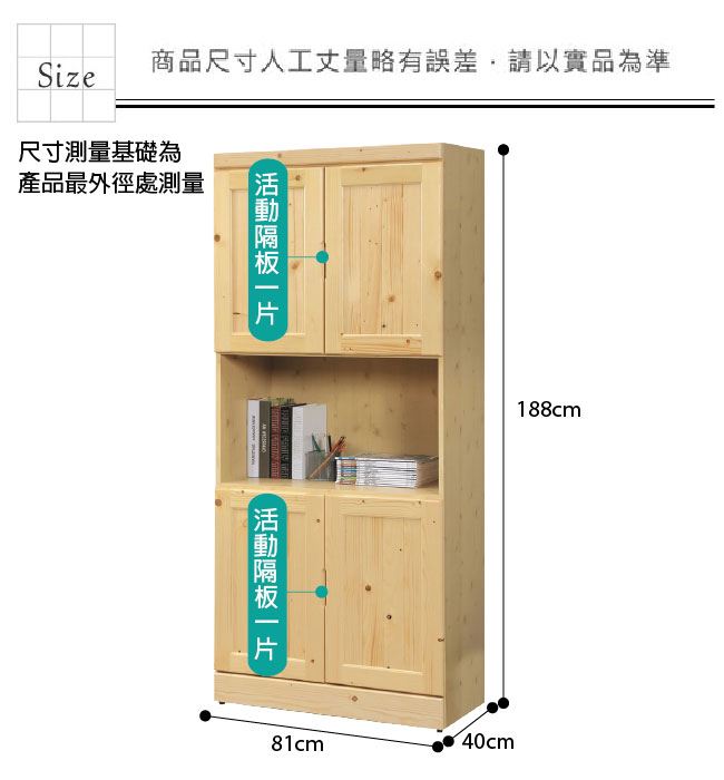 尺寸:(寬)81x(深)40(高)188公分 ◆材質: 材質:松木實木+防蛀木心板+防刮耐磨腳座 噴漆:防潮耐磨噴漆處理 請注意:此款松木櫃外層有木紋木結的紋路結構,屬於自然木材產生,若介意請考慮是否購買此款產品,避免產生誤會或消費糾紛等情形
