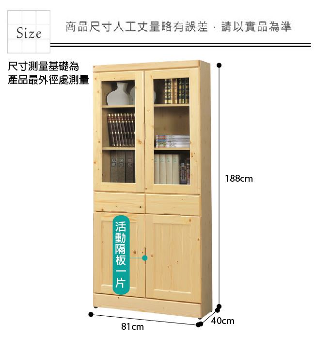 尺寸:(寬)81x(深)40(高)188公分 ◆材質: 材質:松木實木+防蛀木心板+防刮耐磨腳座+五金滑軌結構 噴漆:防潮耐磨噴漆處理 請注意:此款松木櫃外層有木紋木結的紋路結構,屬於自然木材產生,若介意請考慮是否購買此款產品,避免產生誤會或消費糾紛等情形