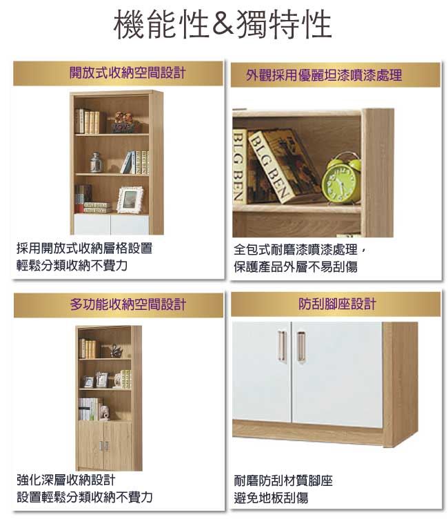 商品 介紹 | 【綠家居】夏多利2.6尺開放三格雙開門書櫃/收納櫃(二色可選) 二色可選+現代簡約風格+安心材質製造,整體採用防蛀木心板+防刮耐磨腳座+五金滑軌結構等安心材質製造,產品外層採用防潮耐磨&亮面噴漆處理搭配採用雙開門櫃+開放式三層格等收納空間設計,全由專人配送到家,專業安心服務,替你省下更多時間! 【商品特色】 二色可選+現代簡約風格+安心材質製造,使用放心+搭配居家更便利 採用防蛀木心板+防刮耐磨腳座+五金滑軌結構等安心材質製造 產品外層採用防潮耐磨&亮面噴漆處理 搭配採用雙開門櫃+開放式三層格等收納空間設計 此商品不需要DIY組立,此商品為組立後之成品 品質保證、專業設計、貼心服務 全由專人配送到家,專業安心服務,替您省下更多時間 |