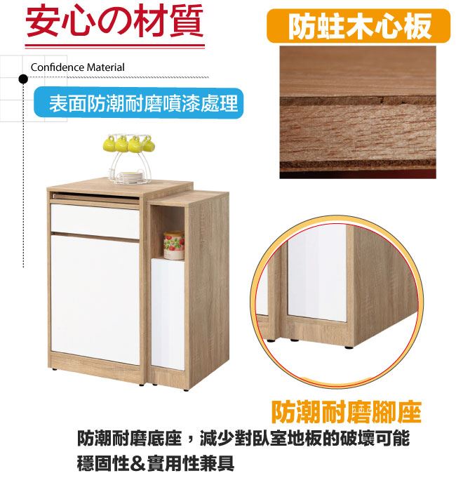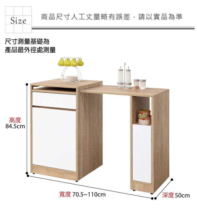 材質 | ◆產品名稱:【綠家居】溫斯2.4尺可伸縮中島桌櫃(二色可選) 尺寸:(寬)70.5-110x(深)50(高)84.5公分 ◆材質: 材質:防蛀木心板+防潮耐磨腳座+五金滑軌結構+防夾手緩衝門片五金 噴漆:防潮耐磨&亮面噴漆處理