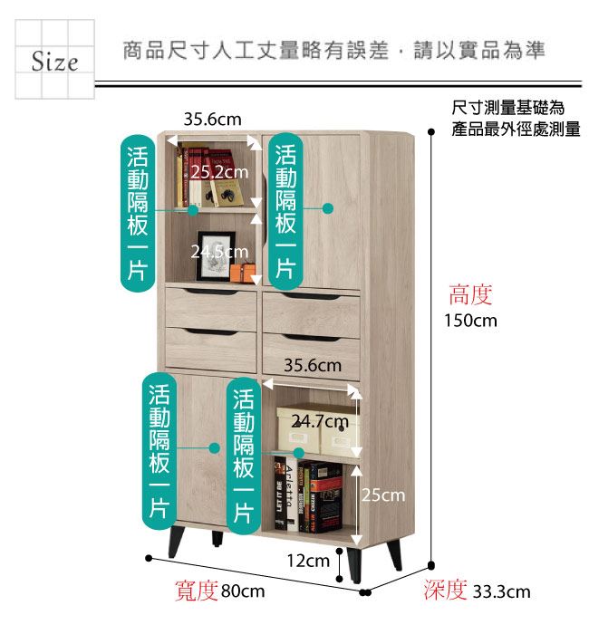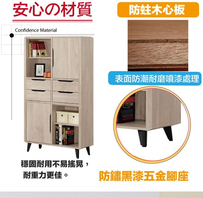 材質 | ◆產品名稱:【綠家居】麥格妮2.7尺二門四抽書櫃/收納櫃 尺寸:(寬)80x(深)33.3(高)150公分 ◆材質: 材質:防蛀木心板+防鏽黑漆五金腳座+五金滑軌結構+防夾手緩衝門片五金 噴漆:防潮耐磨噴漆處理