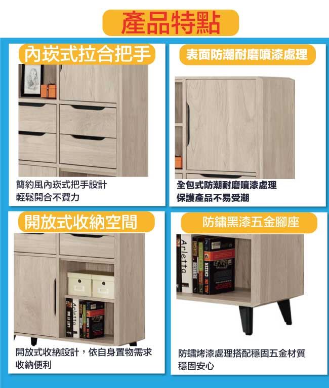商品 介紹 | 【綠家居】麥格妮2.7尺二門四抽書櫃/收納櫃 橡木紋色系+現代簡約風格+安心材質製造,使用放心+搭配居家更便利,整體採用防蛀木心板+防鏽黑漆五金腳座+五金滑軌結構+防夾手緩衝門片五金等材質搭配外層採用優莉坦耐磨全包式噴漆處理 ,採用開門櫃+四抽屜+開放式收納等收納空間設計,全由專人配送到家,專業安心服務,替你省下更多時間! 【商品特色】 橡木紋色系+現代簡約風格+安心材質製造,使用放心+搭配居家更便利 防蛀木心板+防鏽黑漆五金腳座+五金滑軌結構+防夾手緩衝門片五金等材質 採用開門櫃+四抽屜+開放式收納等收納空間設計 此商品不需要DIY組立,此商品為組立後之成品 品質保證、專業設計、貼心服務 全由專人配送到家,專業安心服務,替您省下更多時間 |