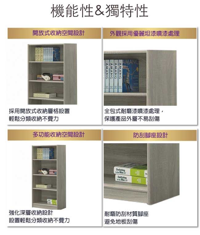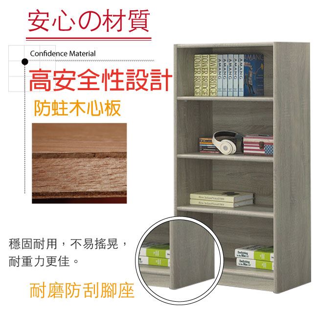 商品 介紹 | 【綠家居】迷夏利2尺開放式四格書櫃 淺灰橡木紋色系+現代簡約風格+安心材質製造,整體採用防蛀木心板+防刮耐磨腳座等安心材質製造,產品外層採用防潮耐磨噴漆處理搭配採用開放式四層格收納空間設計,全由專人配送到家,專業安心服務,替你省下更多時間! 【商品特色】 淺灰橡木紋色系+現代簡約風格+安心材質製造,使用放心+搭配居家更便利 採用防蛀木心板+防刮耐磨腳座等安心材質製造 產品外層採用防潮耐磨噴漆處理 搭配採用開放式四層格收納空間設計 此商品不需要DIY組立,此商品為組立後之成品 品質保證、專業設計、貼心服務 全由專人配送到家,專業安心服務,替您省下更多時間 |