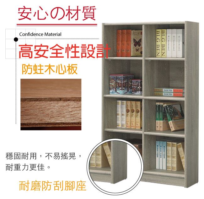 材質 | ◆產品名稱:【綠家居】迷夏利2.7尺開放式八格中高書櫃 尺寸:(寬)82x(深)30(高)122/公分 ◆材質: 材質:防蛀木心板+防刮耐磨腳座 噴漆:防潮耐磨噴漆處理