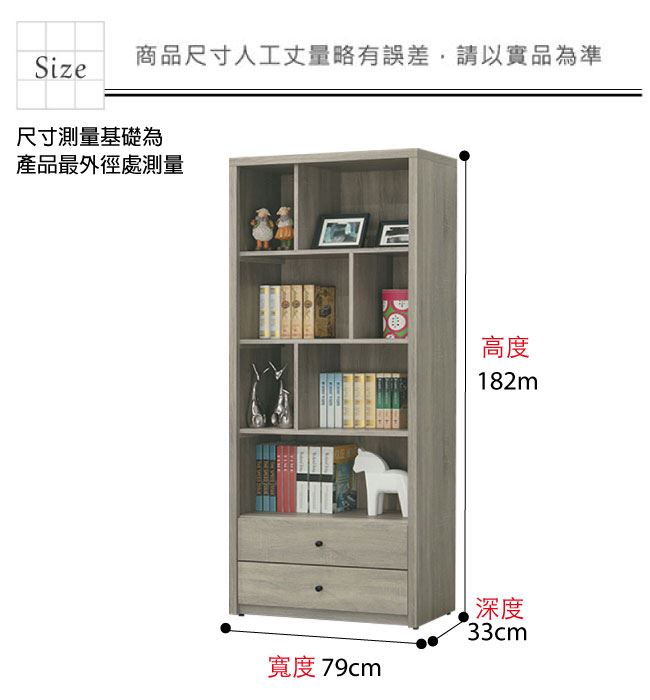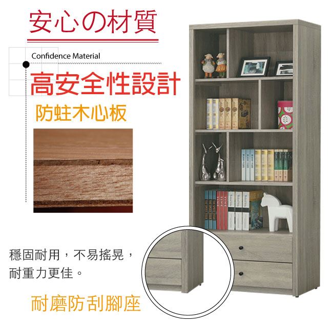 材質 | ◆產品名稱:【綠家居】雅瑪米2.6尺開放七格二抽書櫃/收納櫃 尺寸:(寬)79x(深)33(高)182/公分 ◆材質: 材質:防蛀木心板+防刮耐磨腳座+五金滑軌結構 噴漆:防潮耐磨噴漆處理