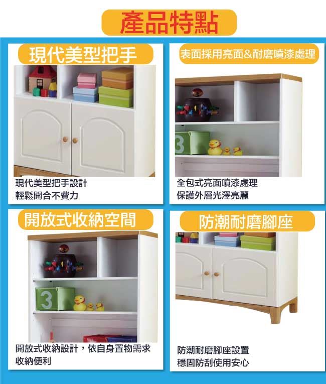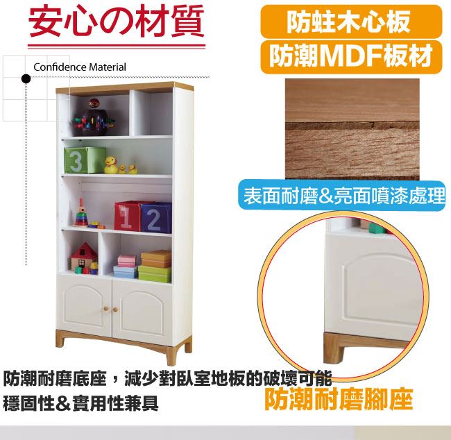 材質 | ◆產品名稱:【綠家居】路可雙色2.7尺二門開放式書櫃 尺寸:(寬)81x(深)38(高)182/公分 ◆材質: 材質:防蛀木心板+防潮MDF板材+防潮耐磨腳座+防夾手緩衝門片五金 噴漆:防潮耐磨&亮面噴漆處理