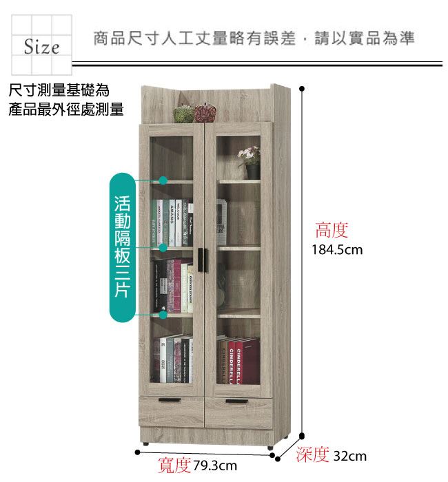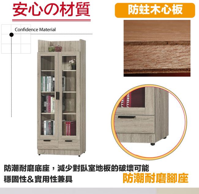 材質 | ◆產品名稱:【綠家居】泰雷2.6尺二門二抽高書櫃 尺寸:(寬)79.3x(深)32(高)184.5公分 ◆材質: 材質:防蛀木心板+防潮耐磨腳座+五金滑軌結構+防夾手緩衝門片五金 噴漆:防潮耐磨噴漆處理