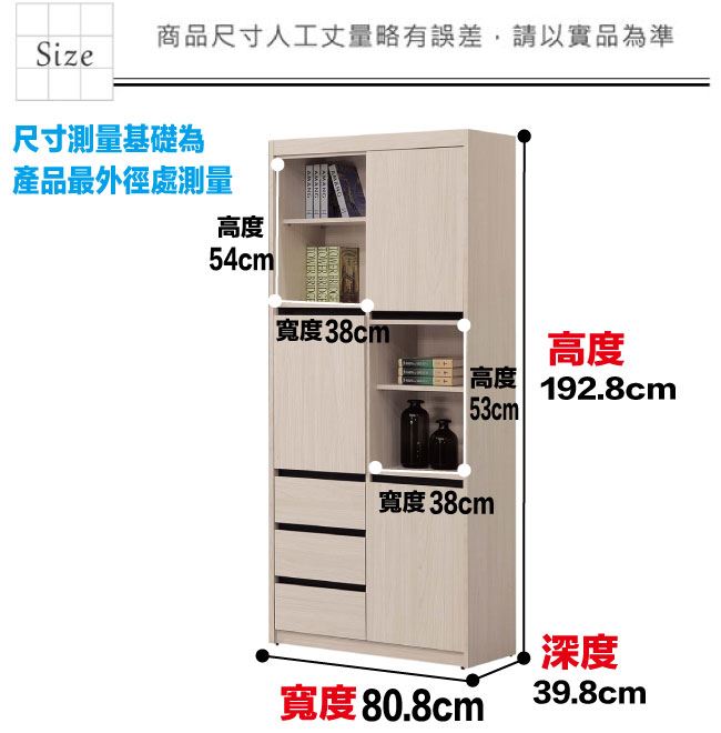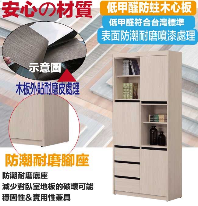 材質 | ◆產品名稱:【綠家居】麥森2.7尺三門三抽書櫃 尺寸:(寬)80.8x(深)39.8(高)192.8/公分 ◆材質: 材質:防蛀木心板+防潮耐磨腳座+五金滑軌結構+防夾手緩衝門片五金 噴漆:防潮耐磨噴漆處理