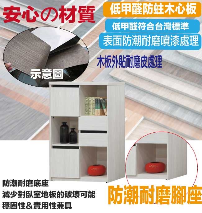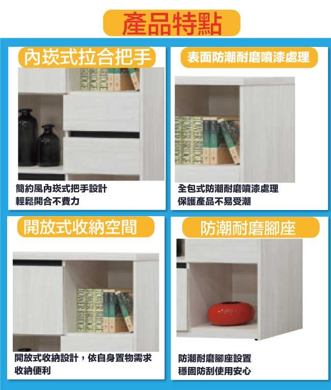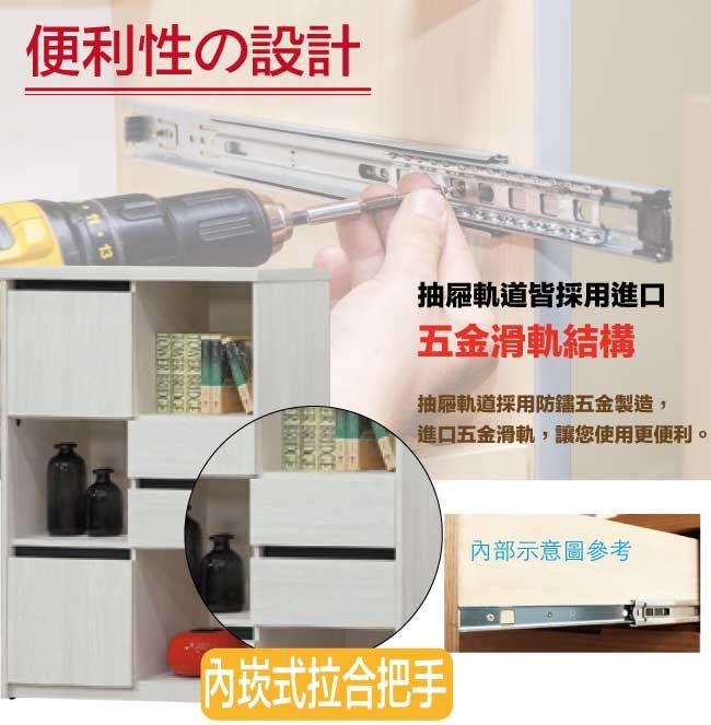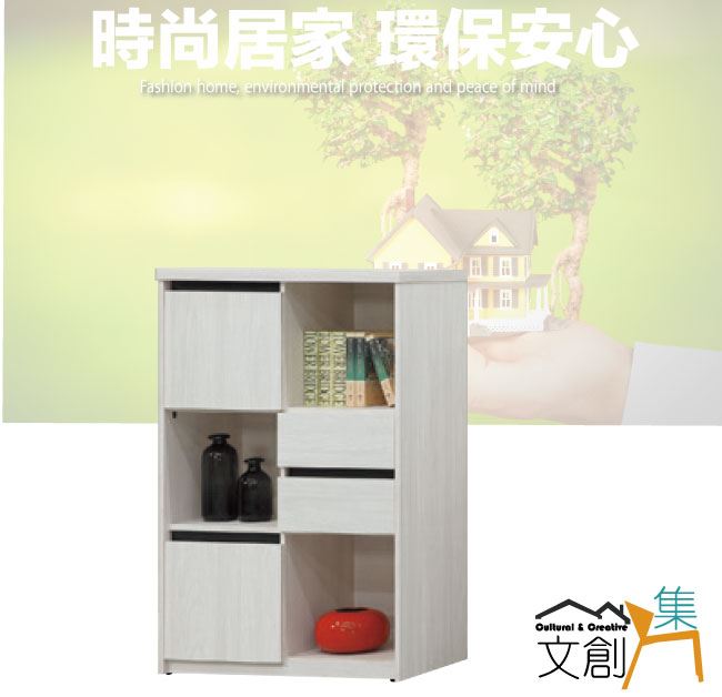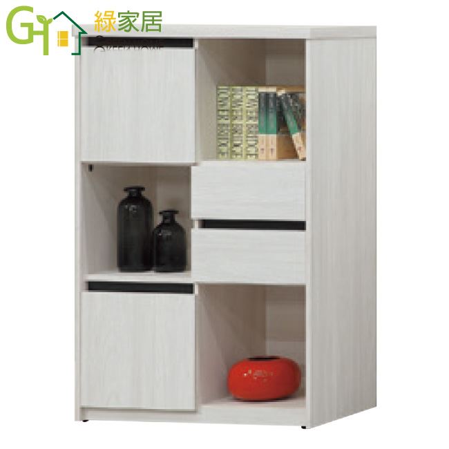 商 品 介 紹 | 【綠家居】卡奇里2.7尺二門二抽中高書櫃/收納櫃 白榆木紋色系+現代簡約風格+安心材質製造,整體採用防蛀木心板++防潮耐磨腳座+五金滑軌結構+防夾手緩衝門片五金等安心材質製造,產品外層採用防潮耐磨噴漆處理搭配採用開門櫃+二抽屜+開放層格等收納空間設計,全由專人配送到家,專業安心服務,替你省下更多時間! 【商品特色】 白榆木紋色系+現代簡約風格+安心材質製造,使用放心+搭配居家更便利 採用防蛀木心板+防潮耐磨腳座+五金滑軌結構+防夾手緩衝門片五金等安心材質製造 產品外層採用防潮耐磨噴漆處理 搭配採用開門櫃+二抽屜+開放層格等收納空間設計 此商品不需要DIY組立,此商品為組立後之成品 全由專人配送到家,專業安心服務,替您省下更多時間