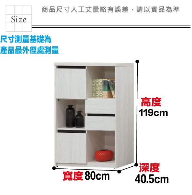 材質 | ◆產品名稱:【綠家居】卡奇里2.7尺二門二抽中高書櫃/收納櫃 尺寸:(寬)80x(深)40.5(高)119/公分 ◆材質: 材質:防蛀木心板+防潮耐磨腳座+五金滑軌結構+防夾手緩衝門片五金 噴漆:防潮耐磨噴漆處理 |