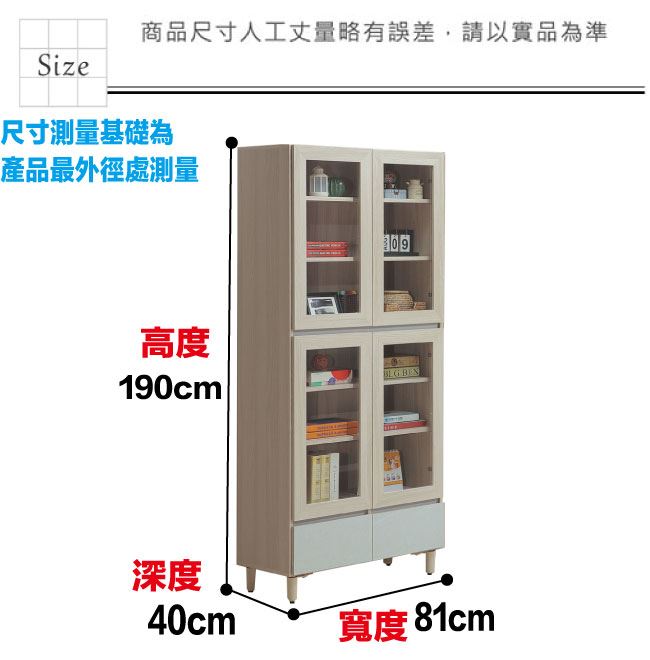 材質 | ◆產品名稱:【綠家居】馬蘭雙色2.7尺四門下二抽書櫃/收納櫃 尺寸:(寬)81x(深)40x(高)190/公分 ◆材質: 材質:防蛀木心板+防潮耐磨腳座+防夾手緩衝門片五金+五金滑軌結構 噴漆:防潮耐磨噴漆處理 |